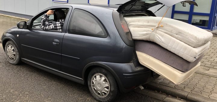 (Kusel, 17.1.2022) Ein skurriler Anblick bot sich der Polizei in Kusel: Ein Mann wollte mehrere Matratzen in einem Kleinwagen transportieren – mit der Sicherung nahm er es nicht so genau.