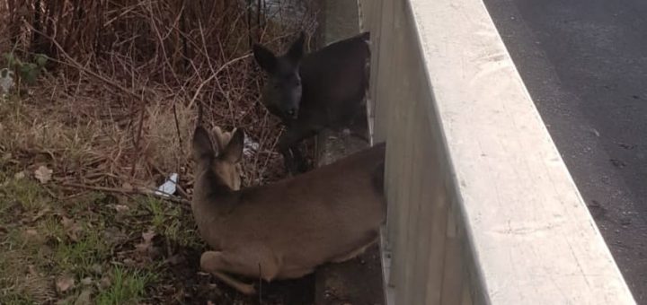 (Gelsenkirchen, 29.1.2022) Zwei Rehe haben sich an einem Brückengeländer in eine missliche Lage gebracht. Zum Glück war die Gelsenkirchener Feuerwehr schnell vor Ort.