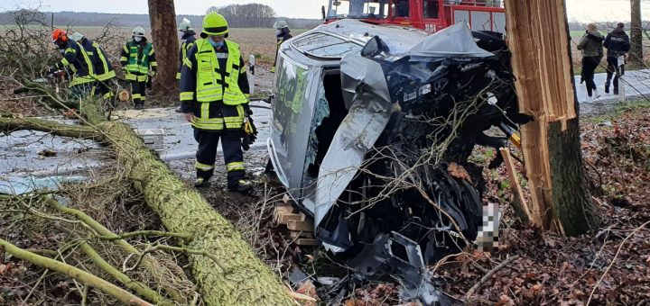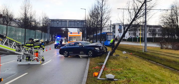 (München, 31.1.2022) Am Sonntag krachte ein 30-Jähriger mit seinem Mercedes in einen Laternenmast und einen Baum. Er und sein Beifahrer wurden leicht verletzt.